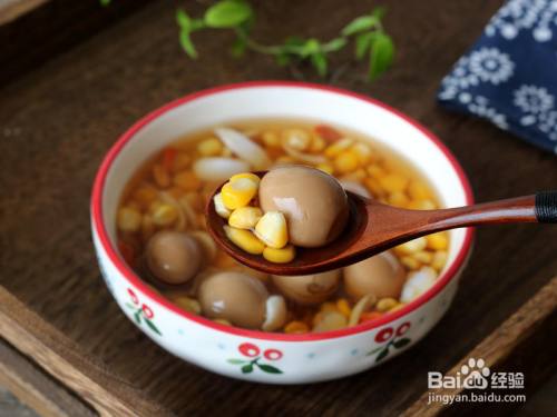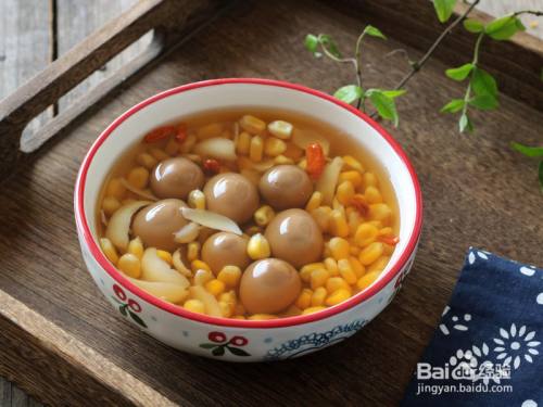 煮好的玉米百合舀到碗里,放上几个鹌鹑蛋,一碗热乎乎的鹌鹑蛋玉米糖水就做好了