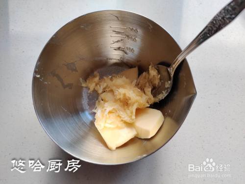 面团发酵的时辰筹办蒜喷鼻黄油馅,蒜瓣捣当作蒜泥,放入软化的黄油中,放盐、糖拌匀。