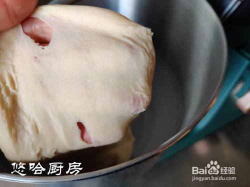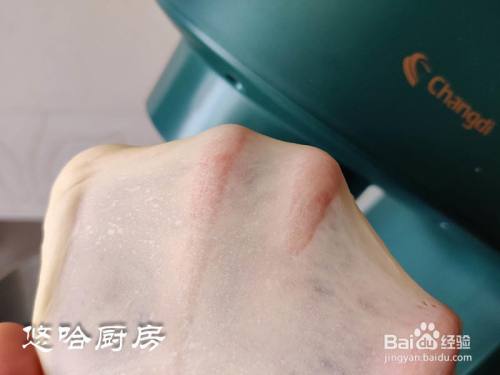 打至面团能拉脱手套膜即可,饺子粉一样能拉脱手套膜。这个面团的含水量不高,出膜的速率稍微慢一点,比日常平凡高水量面团要多打2~3分钟摆布。