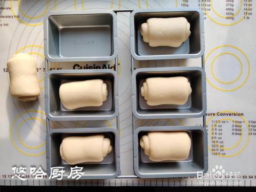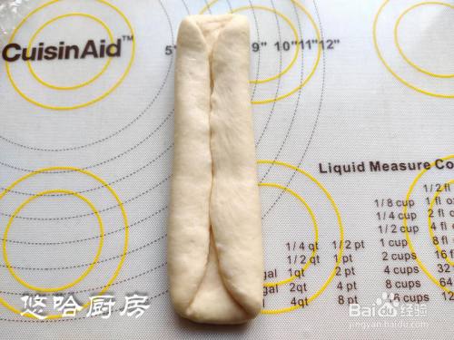 折叠后的面团再次擀长一点,底边压薄,从上至下卷起,放入吐司盒中。