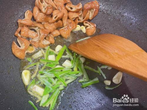 肥肠表皮起头焦黄,就差未几了,把它拨到一边,加一勺油,下葱蒜