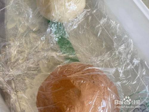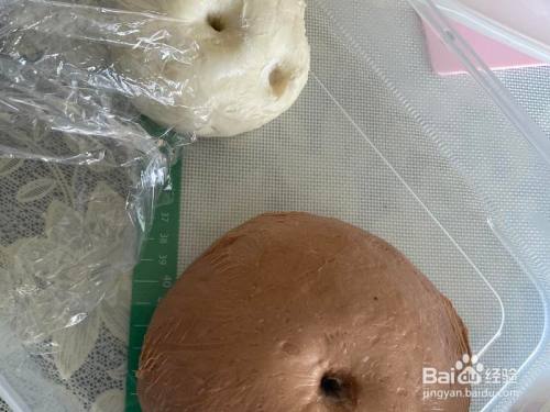 剩下的面团加8克可可粉和5克水,揉到颜色匀称的面团,两个面团团聚放密封盒里举行一发。