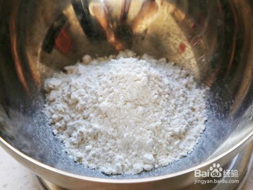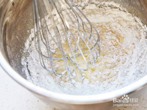 倒入过筛好的粉类翻拌匀称到无颗粒和干粉备用