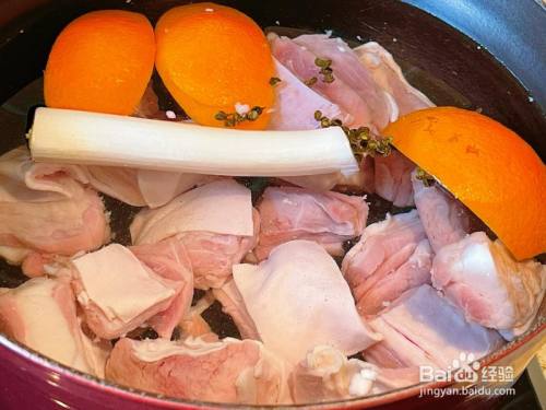 洗净的羊肉冷水入锅 半根大葱 一个橙子皮 少许青花椒 同时放入卤味包 我个人不太喜欢用葱姜蒜料酒去腥 橙子皮是个不错的选择哦