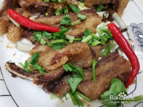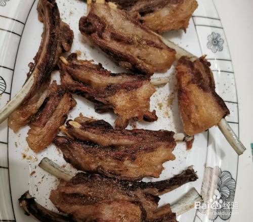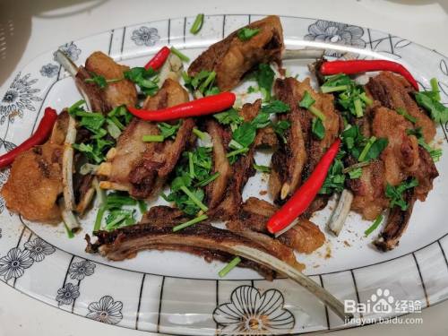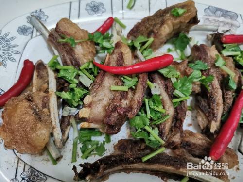 炸好的羊排装盘,然后撒上孜然面儿,辣椒面儿,调味儿