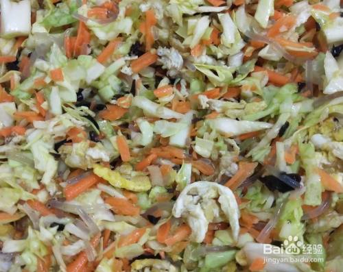 把包菜,胡萝卜切当作丁放入容器里,放入盐杀杀水分,多余的水分倒出来,把泡好的木耳切碎,粉条煮熟切当作小段,鸡蛋炒好放入适量的葱花,盐,十三喷鼻,蚝油,熟油,喷鼻油搅拌匀称备用