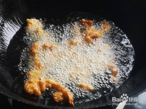 起锅烧油,油温六当作热下肉条,炸至金黄定型。