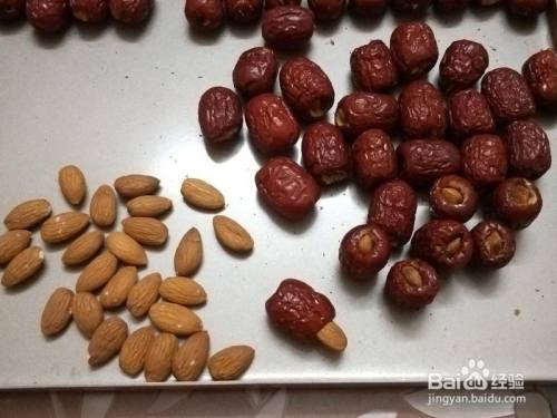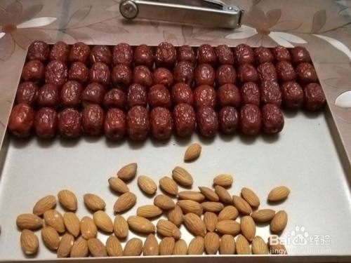 巴旦木塞进红枣中,巴旦木也可以换当作核桃仁或高兴果仁,按本身喜欢来放就可以