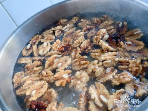 水烧开,插手核桃仁 翻腾后到出,水滤干待用