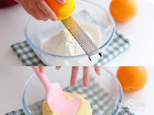 筛入低粉,另有1个橙皮屑(可以用擦丝器,注重不要把白色的部门也擦进去了,会苦),用刮刀压拌当作团。