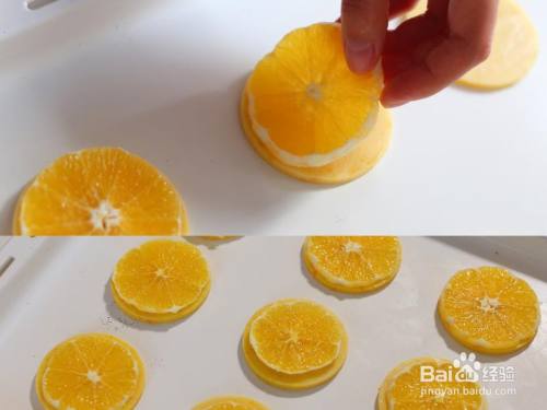 1个橙子去皮,切当作薄片,只管即便切得薄一些(厚度2到3mm摆布),更容易烤干,也更容易生存。然后用厨房纸吸干水分。 用圆形切模或者杯子等等您能找到的东西,切出圆形饼干片(直径比橙子片大一些),摆放在烤盘上,在放上橙子片,送入烤箱,160度烘烤25到30分钟摆布。