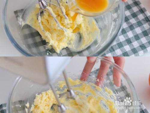 黄油软化到可以用手指轻松按压变形,插手糖粉,先用刮刀按压匀称,防止等下丁宁的时辰飞溅。然后用打蛋器搅打匀称。