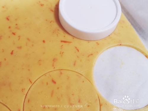 找个比橙子片稍微大一点点的盖子或者杯子压出圆形 残剩的面团又从头捏一下擀一下又可以继续压