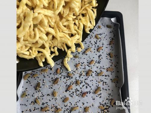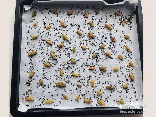 我用的烤盘,您们可以找任何容器,内里铺上油纸,撒上芝麻葡萄干装饰外貌。