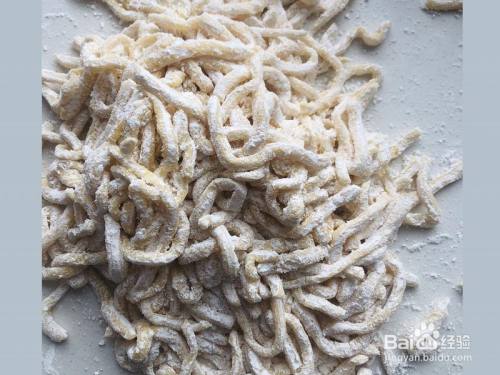 一边切一边注重多撒些淀粉,防止粘在一路,全数切完了可以用筛网把多余的淀粉筛失再下锅炸。
