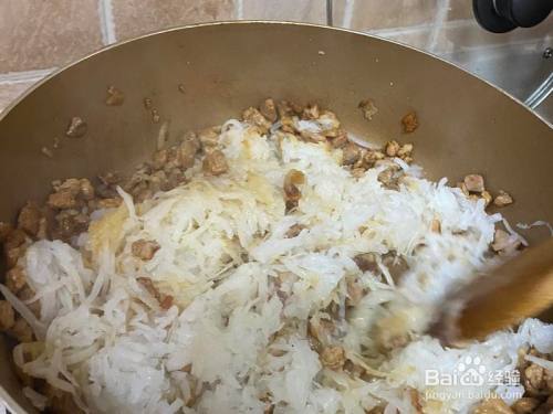 下入萝卜丝翻拌匀称,转小火或者关火