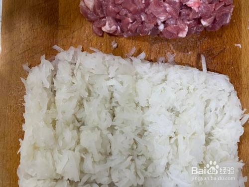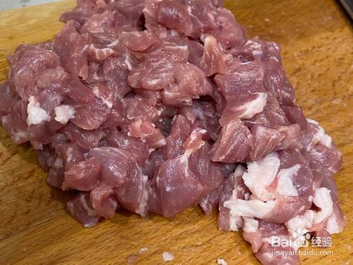 把猪肉切当作小颗颗,肥瘦分隔哦。建议利用夹心肉,肥瘦大概二八分。五花肉也可以,选偏瘦一点的。