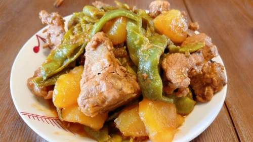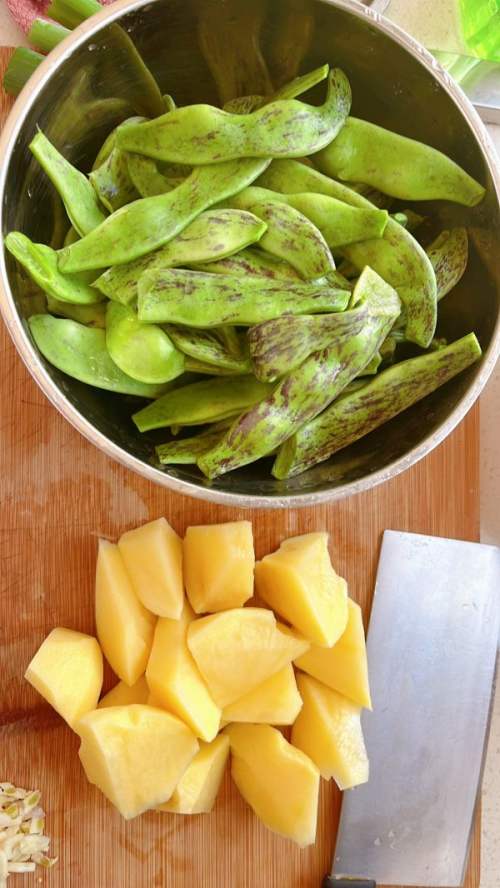 - 4油豆角洗净畜眠,长的掰两半,土豆也用刀掰当作大块