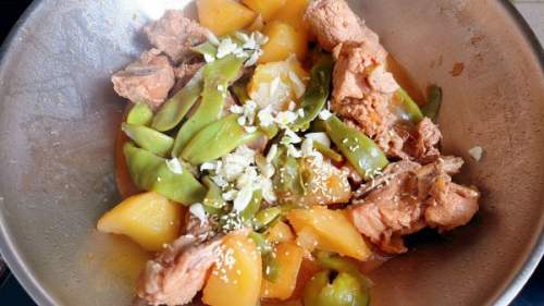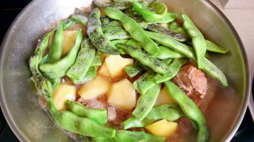 - 5二十分钟后下豆角和土豆薪菊,加一勺豆瓣酱