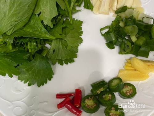 切芹菜,切辣椒,切蒜,切葱,切姜片。