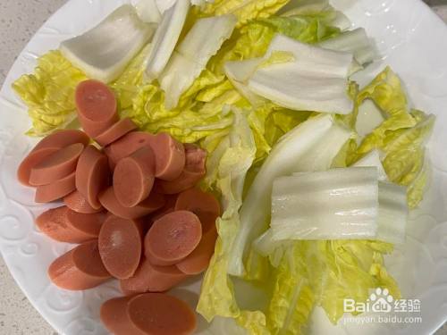 切火腿肠,切洗净的娃娃菜,切一个番茄 当作小块(忘了拍)
