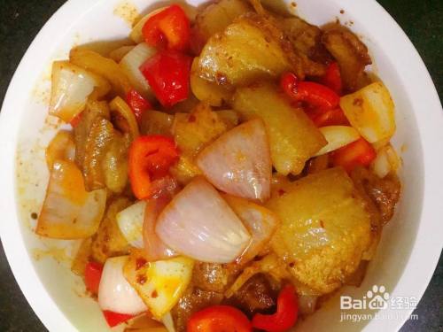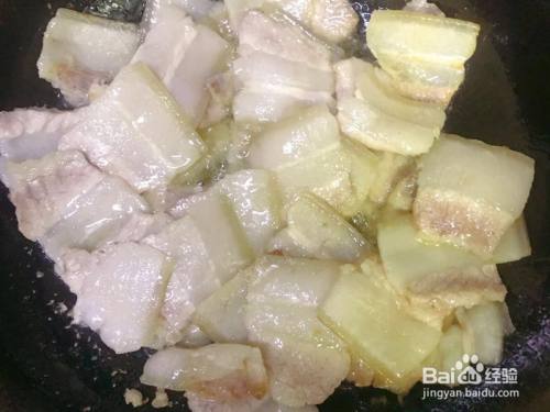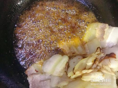 铁锅中倒入少量油,以防粘锅,要是是用不粘锅炒,可以不消加油。 把五花肉的油渍煸出来,炒出喷鼻味,但要注重不要炒得太干了,影响口感。