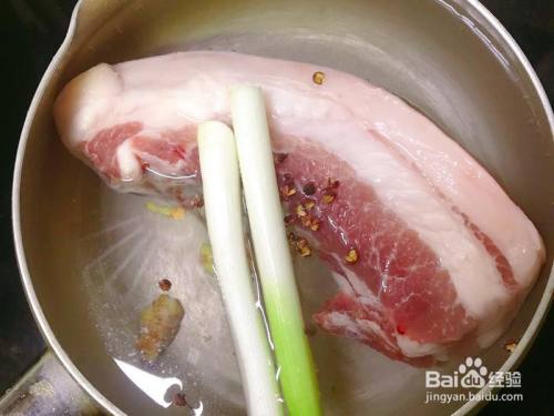 五花肉洗净,加姜(拍破)、大葱、花椒,适量净水,水开后开小火煮30分钟。
