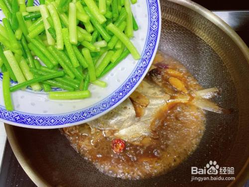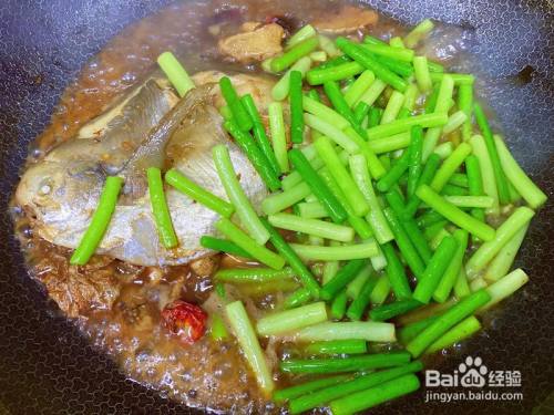大火煮沸在鱼约8-9分熟度时放入提前煸过油的蒜苔,入锅浸汤汁入味。