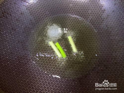 锅里倒入适量油,放入2克盐(连结蒜苔青翠的要害),放几根蒜苔尝尝油温,微微起泡即可。