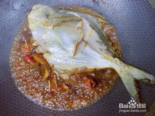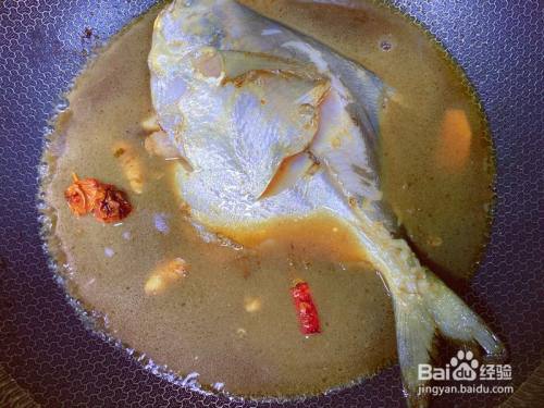 鲳鱼不克不及油煎的太厉害,否则鱼肉就不细嫩了,轻细过下油即可。 先放入2勺生抽,再加3勺料酒,1g糖,放入辣椒入下味。