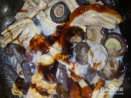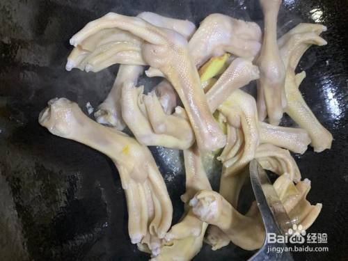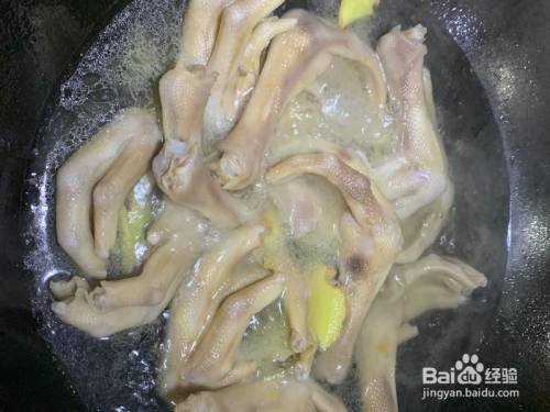 鹅掌洗净飞水。下锅下姜片煸炒。