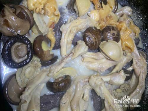 半途记得换水。洗净,炖盅炖它8小时,再泡发1晚。炖过的水不要倒,倒入焖的鹅掌里。