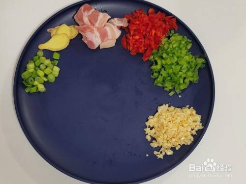 在腌制的时间,我们筹办配菜,青红椒切丁,大蒜切沫,五花肉切片,用豆腐的伴侣把豆腐切片,用洋葱的伴侣把洋葱切块。