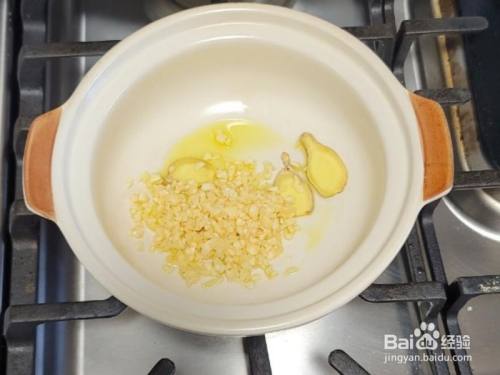 砂锅中倒少许油,开小火,放入姜片和蒜末炒匀。
