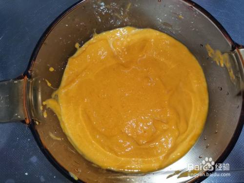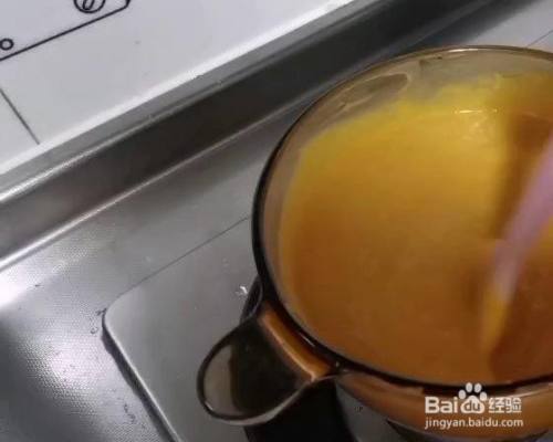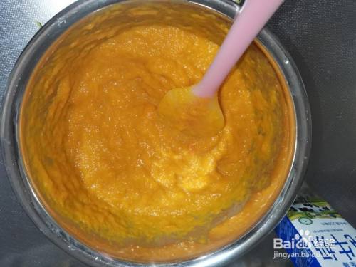 加牛奶,搅拌。只要南瓜选对了,蒸透了,压根用不到什么摒挡机啊行止理,搅拌几下就酿成糊糊了。