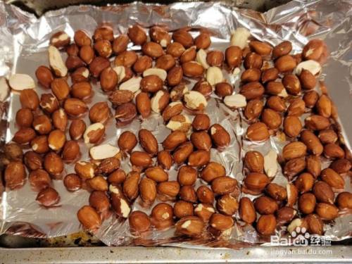 花生放烤盘,350华氏度烤10分钟。或在炒锅里小火慢炒