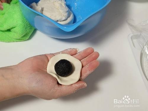 揪一个小面团按扁,把馅料放在中心。 这是芝麻馅的