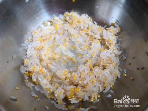 先腌米和玉米粒(用半1汤匙油和1汤匙盐)拌一下