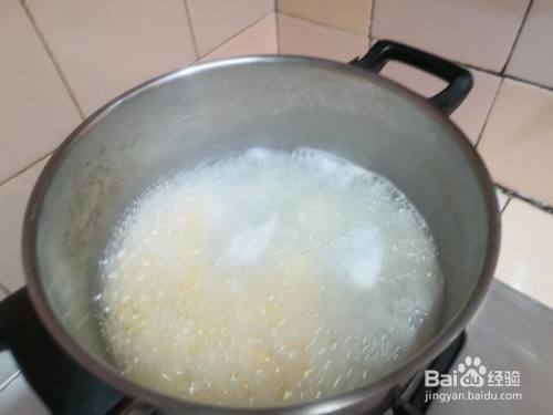 大火煮开水(5碗水),然后放腌好的米和玉米粒,大概5-10分钟后关小火,记得用勺子轻拌制止粘锅
