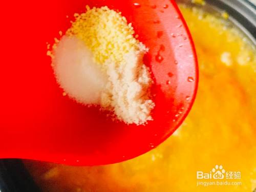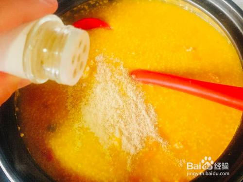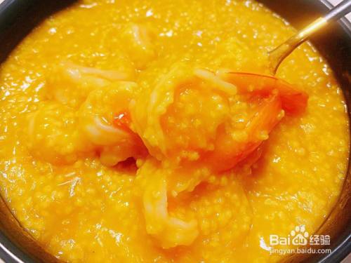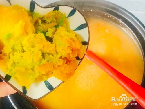 浸泡过的小米很容易煮,您做好这些筹办事情的时辰,小米已经着花略粘稠了,这时辰下入南瓜泥正合适,捣均匀,要是有块状的,勺子按压一下即可。
