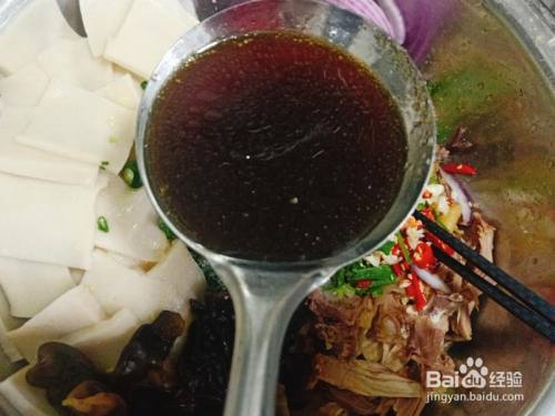 鸡肉煮好以后,用凉水过一下,用凉水过的鸡肉鸡皮比力劲道,用手撕当作条,可以放一些本身喜欢的配菜,我放了洋葱,千页豆腐,木耳(千页豆腐跟木耳提前焯水备用)