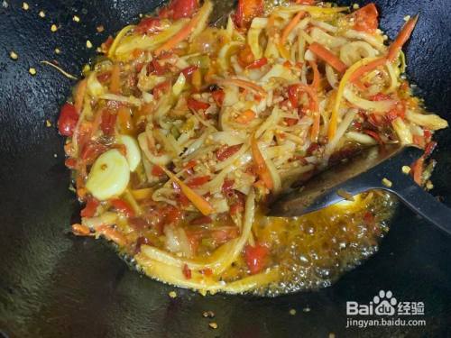 起头正式做鱼,煎鱼剩的油不要华侈,下锅烧热,小火煎豆瓣酱,炒喷鼻后放生姜,花椒,大蒜,泡椒,泡姜,泡萝卜炒一分钟,然后放煎好的鱼,然后加料酒,生抽提味