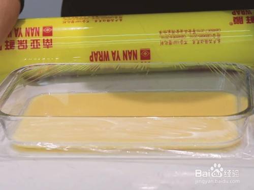将剩下的蛋液倒入,接着盖上保鲜膜放进蒸箱