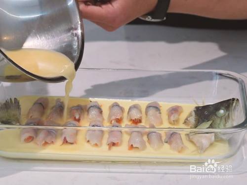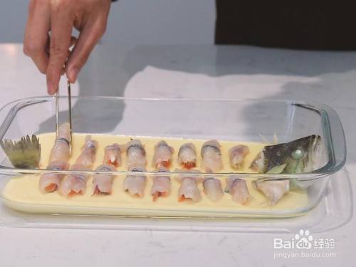 在蒸好的蛋液上罢休鱼头鱼尾和鲈鱼卷(这个造型是不是很贵色样子)