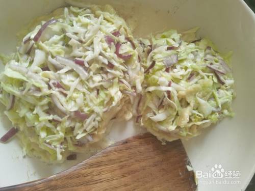 把切丝儿倒进面糊里,加一小撮盐,撒点儿胡椒粉,搅吧搅吧。这时辰视环境加点儿水,确保菜丝儿都裹上点儿面糊
