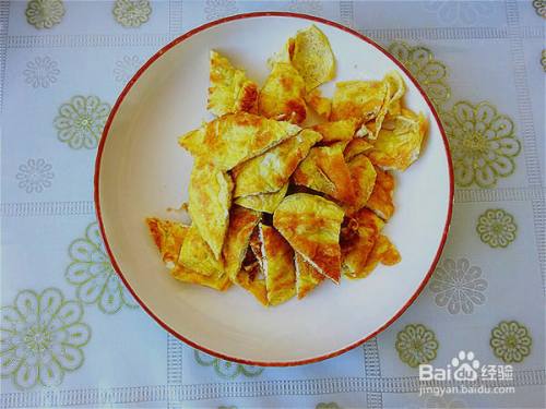 步调5 鸡蛋打散,用平底锅摊当作鸡蛋饼,在切当作菱形块