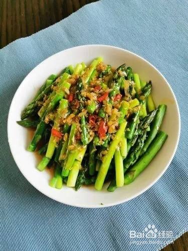 拌好的芦笋盛在盘中摆盘即可。