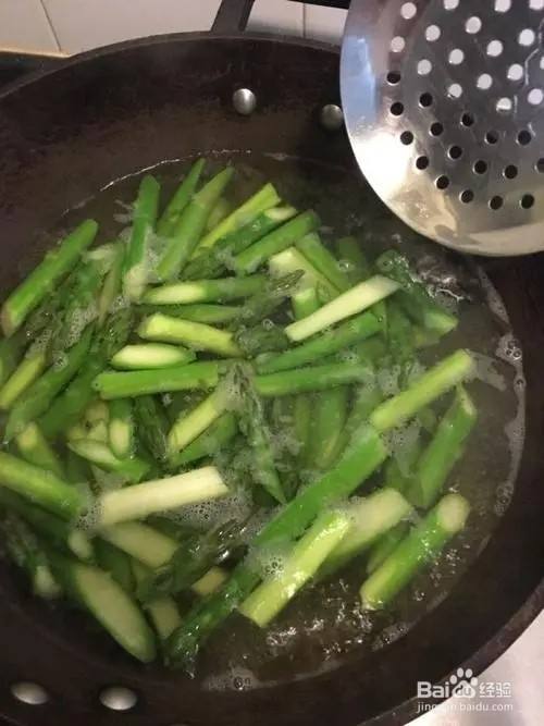芦笋洗濯后切当作小段,放入滚水中焯3分钟捞出沥水。