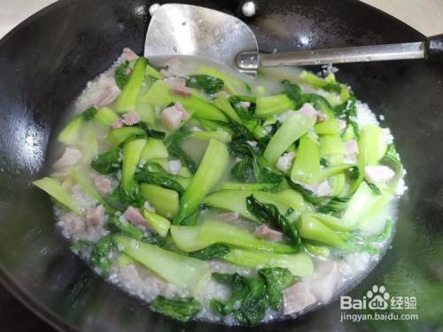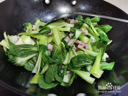 插手洗好沥干的青菜,我的是小青菜,喜欢一叶叶的,看个人爱好改刀,全程大火,炒软加盐,盐要看咸肉咸度和米的几多等等环境,我大概下了3克,再加一点点糖提鲜