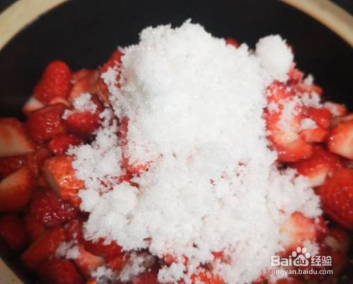 切好的草莓 放入无水无油的砂锅, 倒入白砂糖120--150克, 翻拌匀称 静置半小时以上(30分钟---2小时到)